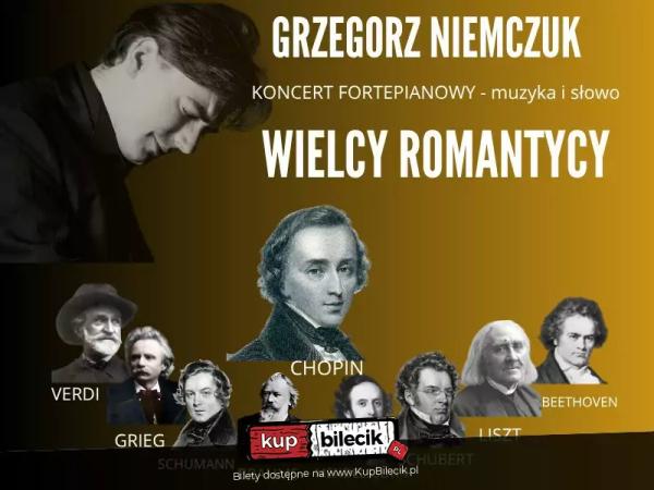 Epoka Romantyzmu była w muzyce reprezentowana przez bardzo wiele wybitnych osobowości. W programie "Wielcy Romantycy" pianista Grzegorz Niemczuk wybrał aż dziewięciu kompozytorów, układając niezwykle zróżnicowany i bogaty program. Publiczność będzie miała okazję usłyszeć wiele bardzo znanych utworów fortepianowych takich jak "Marzenie" Roberta Schumanna, "Dla Elizy" Ludwiga van Beethovena, Walca Johannesa Brahmsa, Suitę Peer Gynt Edwarda Griega czy słynną, wirtuozowską Rapsodię Węgierską nr 2 Franciszka Liszta. Dodatkowo zabrzmią równie piękne i fascynujące utwory Schuberta, Mendelssohna, Chopina oraz Verdiego (w transkrypcji F. Liszta).